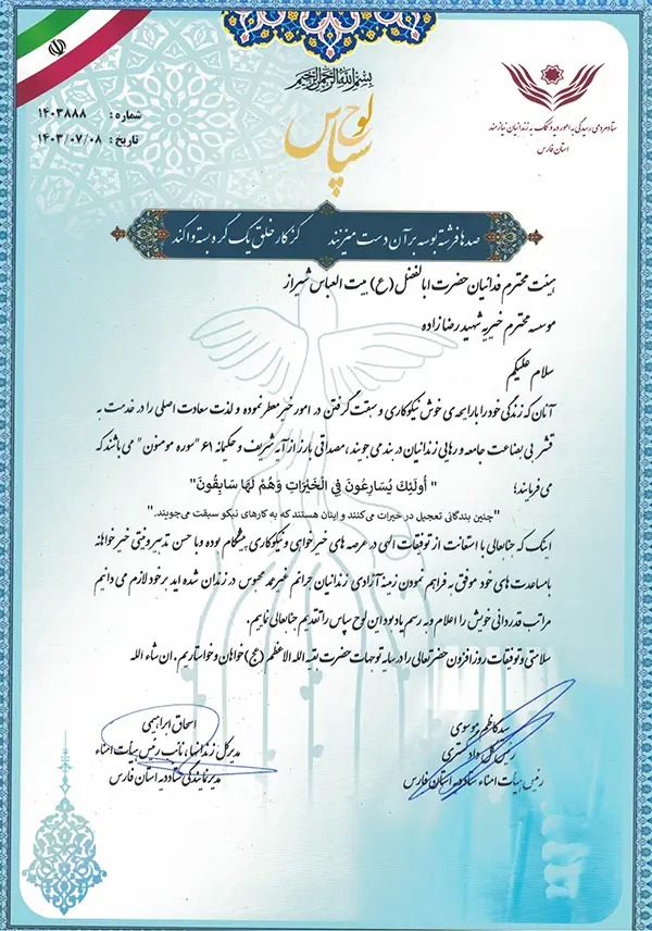 به توفیق الهی سال گذشته همزمان با برگزاری مراسم استقبال از اربعین در بیت العباس شیراز توسط هیئت متحده فداییان اباالفضل (ع) و موسسه شهید سید حمید رضا رضا زاده ،بمنظور آزاد سازی زندانیان جرائم غیر عمد مالی مجموعا مبلغ ۶.۴۷۷.۰۰۰.۰۰۰ ریال جمع آوری شد که دو میلیارد ریال آن توسط موسسه و مابقی توسط خیرین و مردم علاقه مند و نهاد های حمایتی تامین گردید.